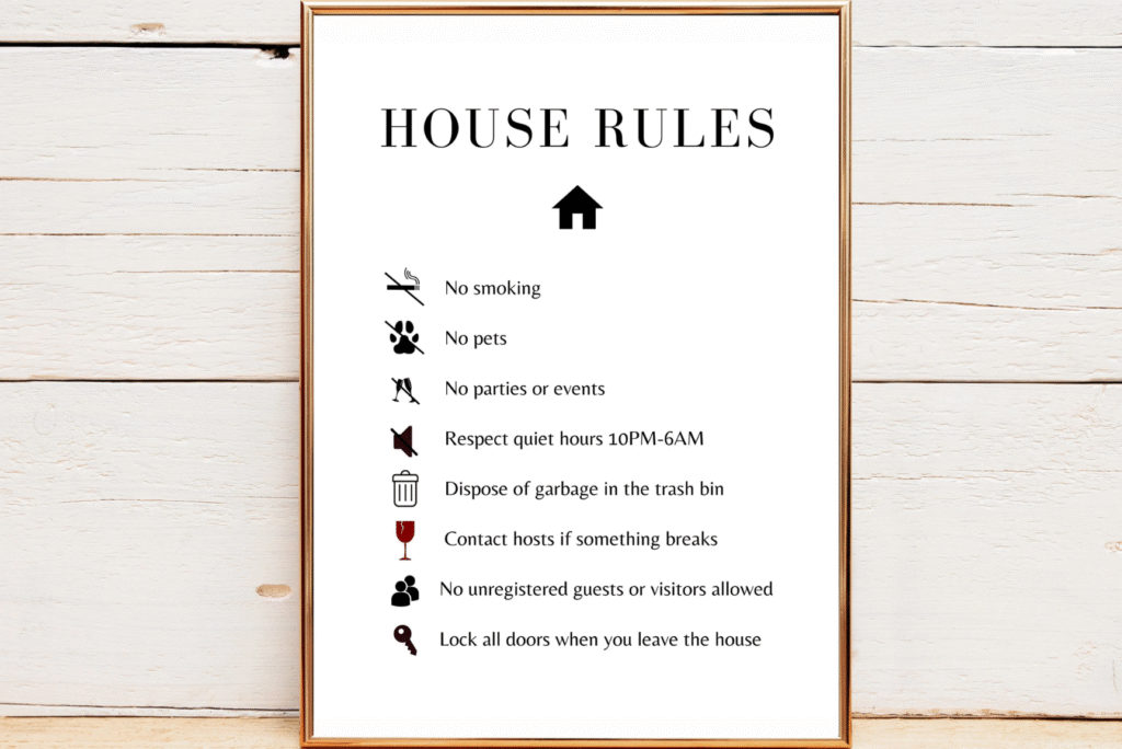 Clear house rules can prevent misunderstandings and discourage rule-breakers before they arrive. Make sure your rules cover:Â Â